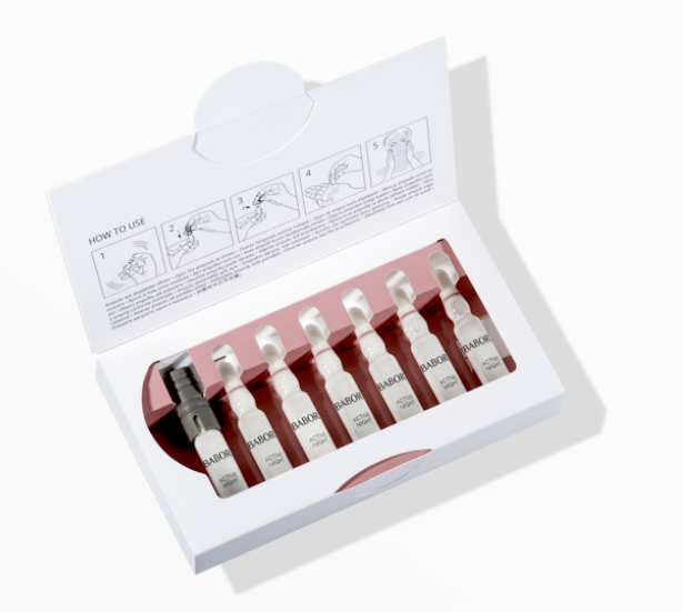 Het gebruik: Na de reiniging de ampul goed schudden en de ampulhals met een tissue of met de meegeleverde ampulopener bedekken. De ampul aan de hals of aan de opener vastnemen en de ampul met een trekkende beweging aan de onderste, witte ring openbreken. Het concentraat in de handpalm gieten en over het gezicht, de hals en het decolleté verdelen. Zachtjes in de huid inkloppen. Vervolgens de verzorgingscrème aanbrengen.