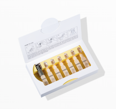 Het gebruik: Na de reiniging de ampul goed schudden en de ampulhals met een tissue of met de meegeleverde ampulopener bedekken. De ampul aan de hals of aan de opener vastnemen en de ampul met een trekkende beweging aan de onderste, witte ring openbreken. Het concentraat in de handpalm gieten en over het gezicht, de hals en het decolleté verdelen. Zachtjes in de huid inkloppen. Vervolgens de verzorgingscrème aanbrengen.