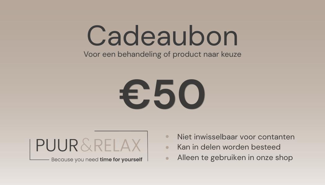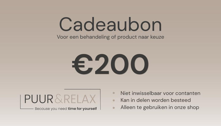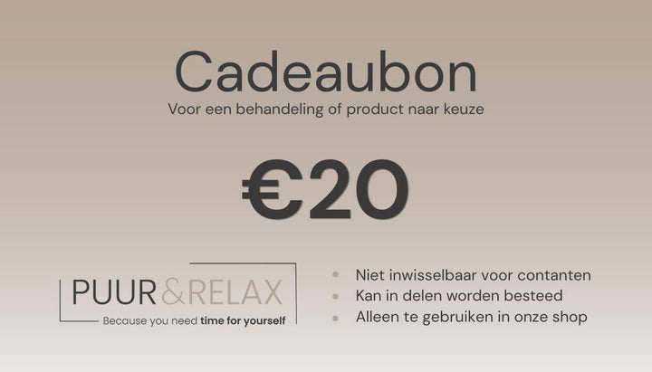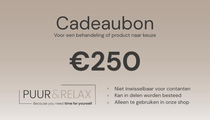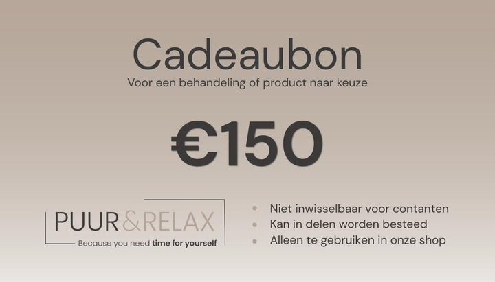 De Puur & Relax Cadeaubon is het perfecte cadeau voor verjaardagen, feestdagen, als bedankje of gewoon ‘omdat iemand het verdient’. De ontvanger kan de bon vrij besteden aan elke gewenste behandeling: van luxe glow facials tot ontspanningsmassages en beautyarrangementen.